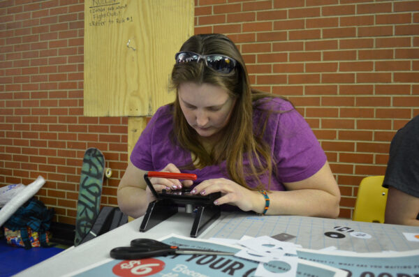 J. Elkins, graphic design major, making buttons for Badgerama with the Command Z club on April 17, 2014.